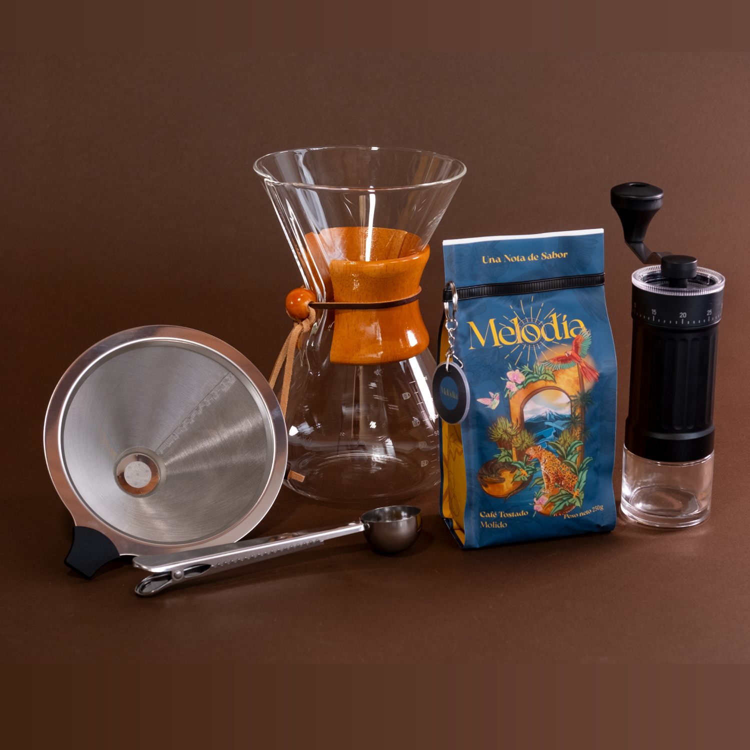 Este kit incluye café de especialidad x250 gr, puedes elegir castillo lavado o tabi honey, Metodo Chemex con filtro de metal, un molino manual graduable y cuchara metálica dosificadora.
